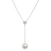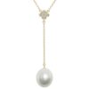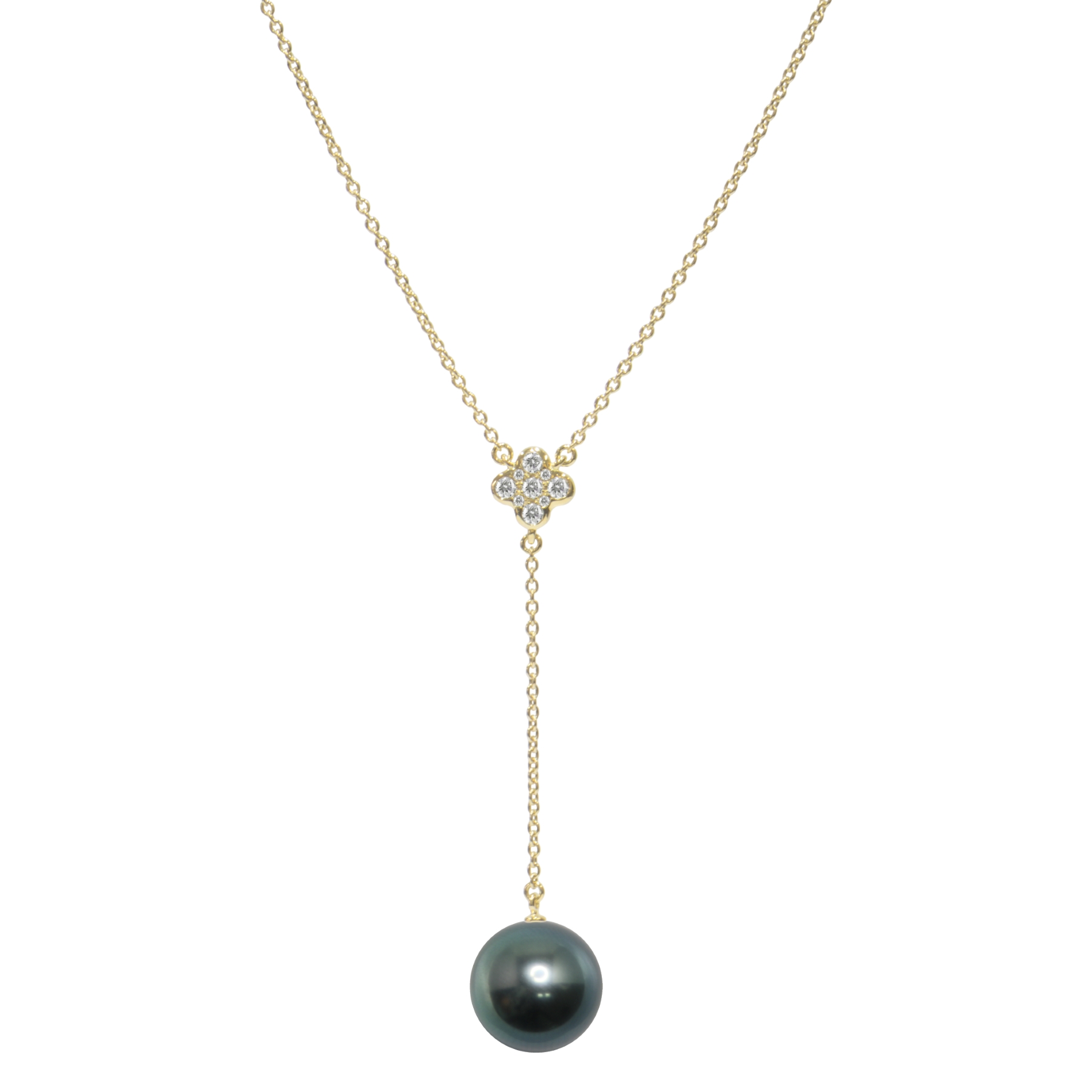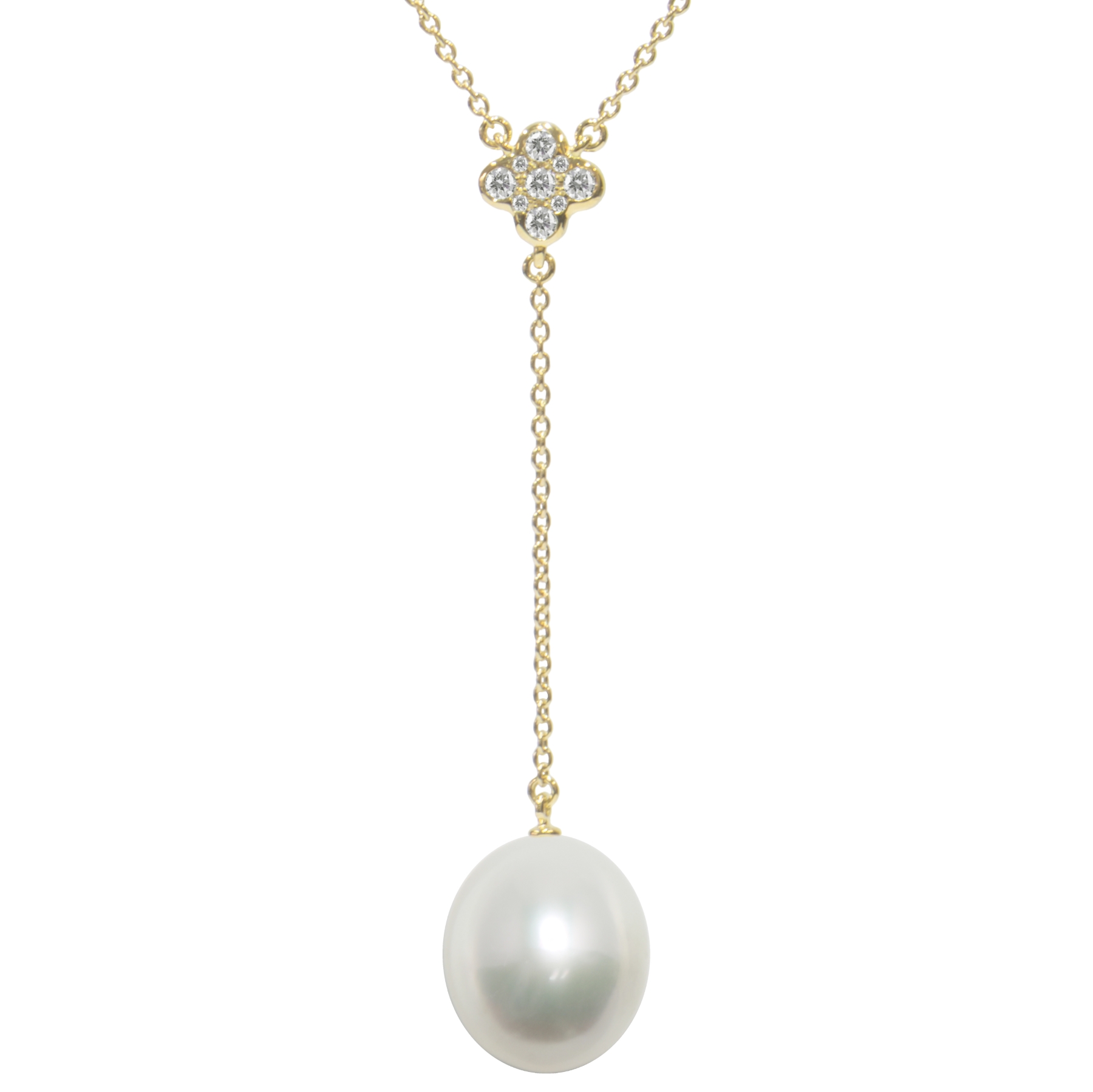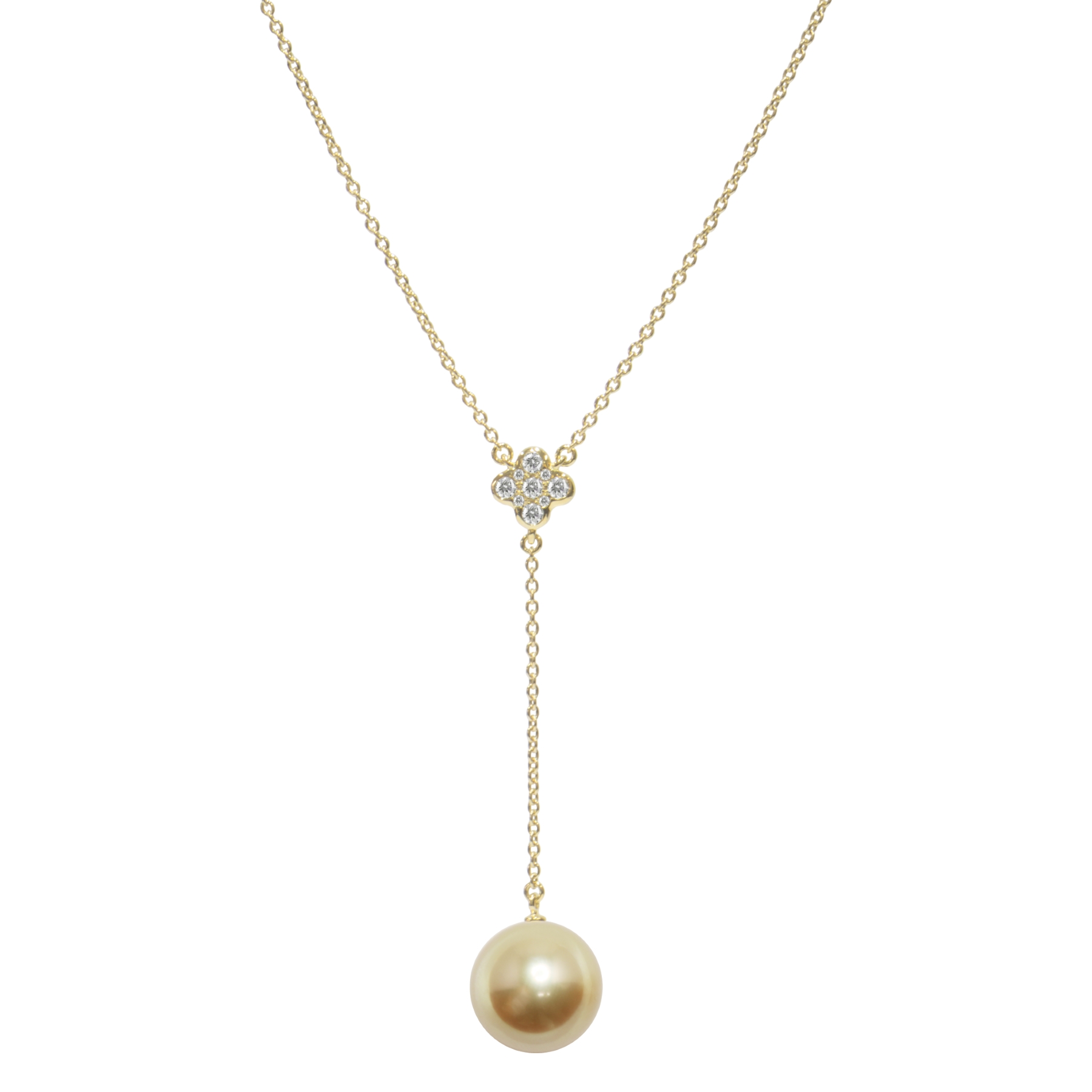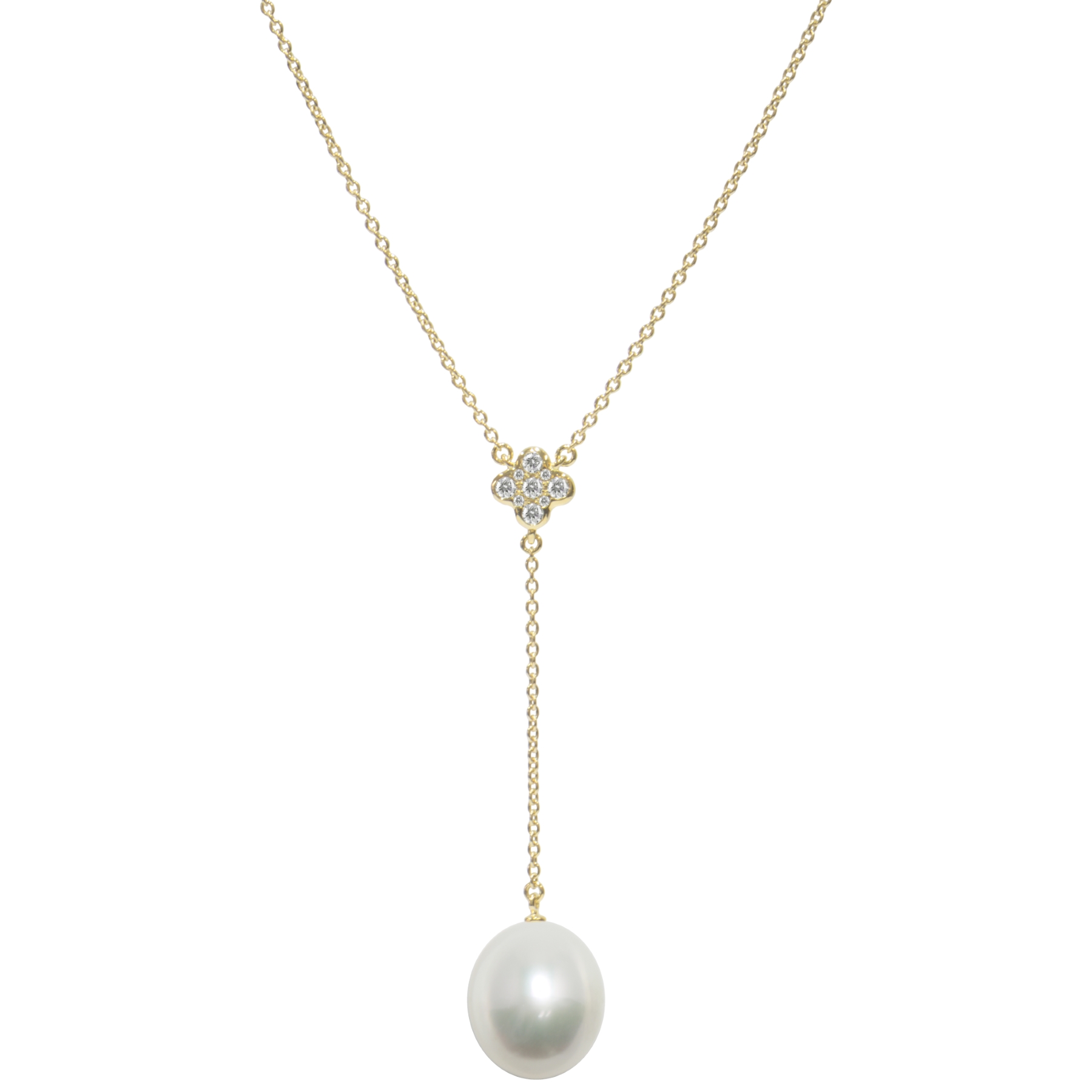 This 18ct yellow gold exquisite lariat necklace showcases a delicate floral motif adorned with 0.14ct diamonds. Measuring 42cm in length with a 3cm drop.
