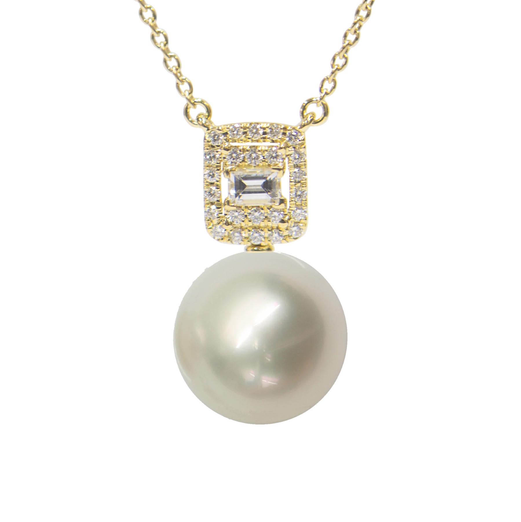 This 18ct yellow gold 42cm necklace showcases a stunning retangular halo of 0.25ct diamonds.