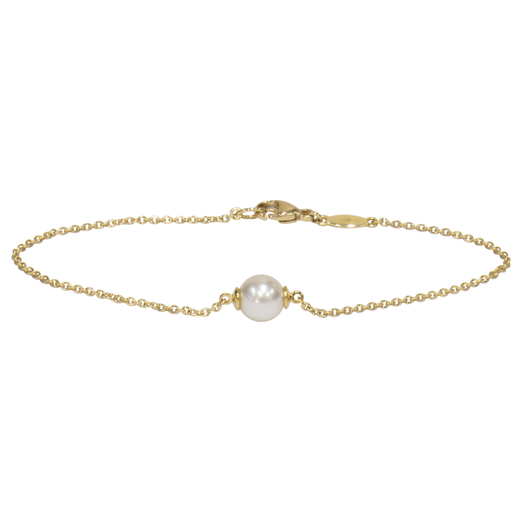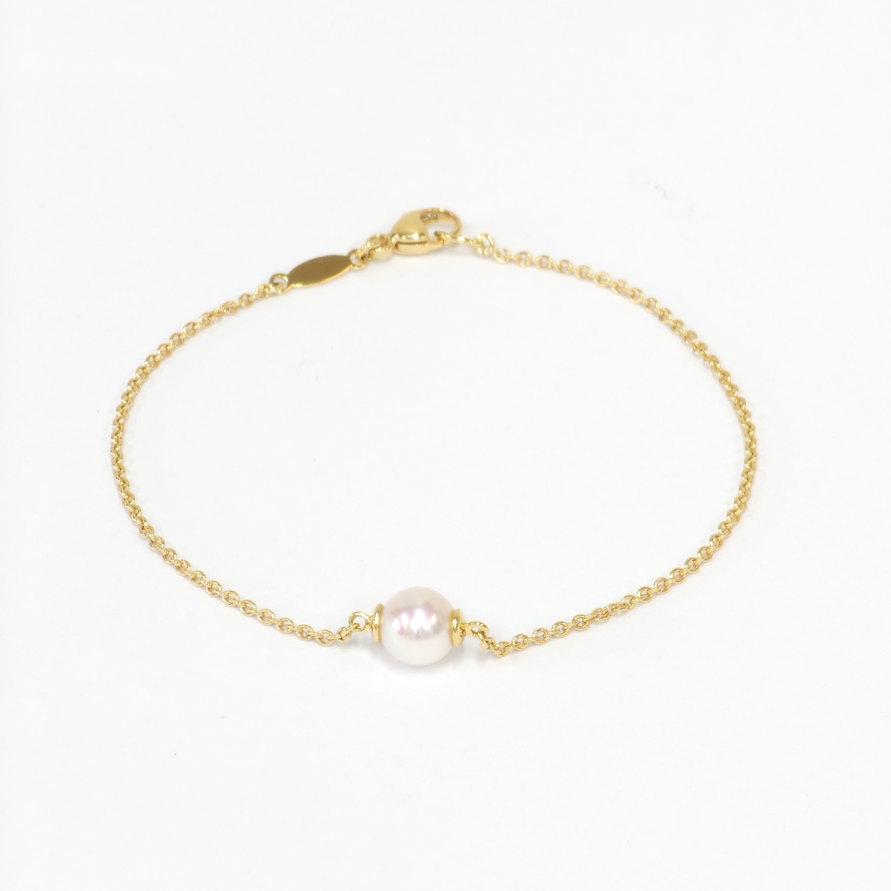 A timeless 18ct yellow gold bracelet showcasing a single, luminous Japanese Akoya white rose pearl (6.5–7mm) at its centre — a delicate statement of elegance and refinement.