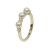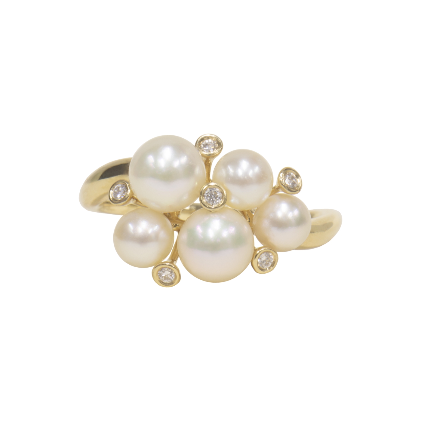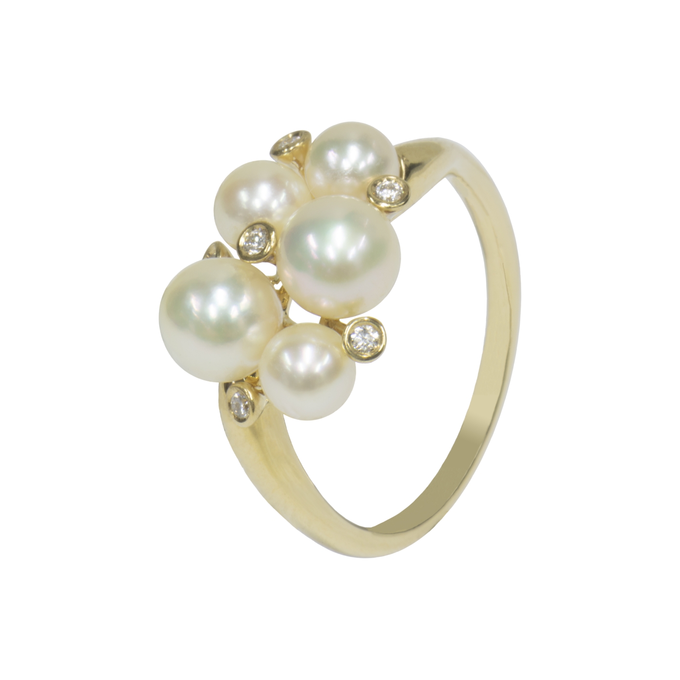 A beautiful 18ct yellow gold ring featuring 0.07ct diamonds and five Japanese Akoya 4.5-6mm cream pearls.