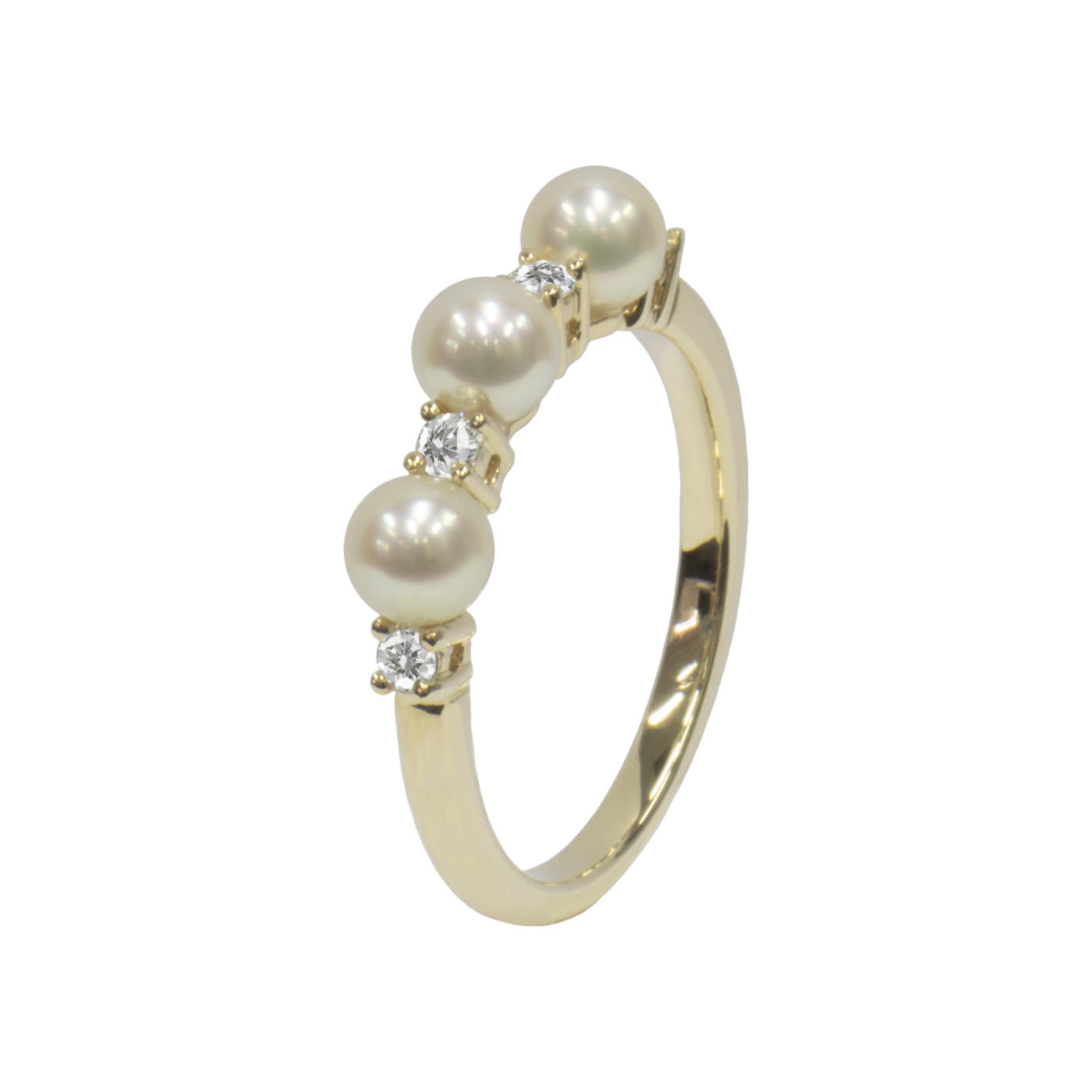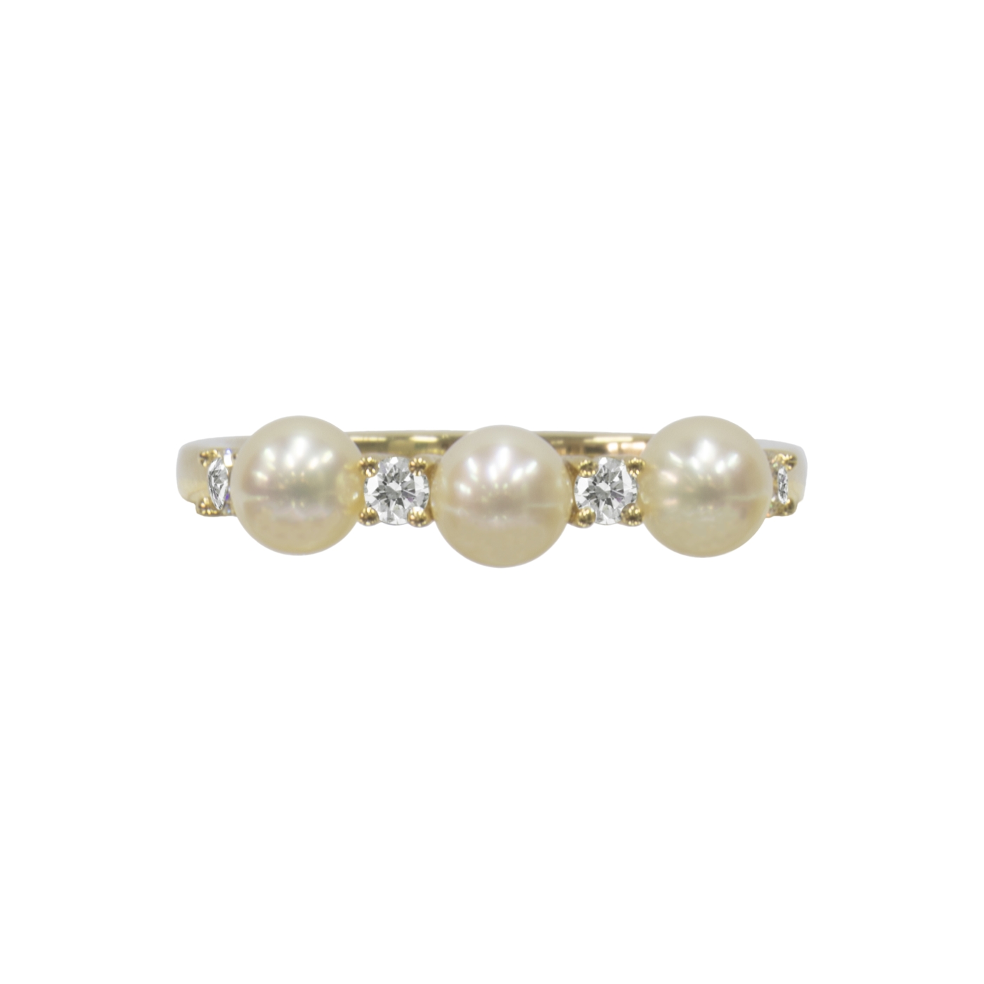 A beautiful 18ct yellow gold ring featuring 0.16ct diamonds and three Japanese Akoya 4-4.5mm cream pearls.